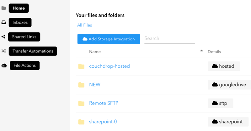 Couchdrop works with multiple cloud storage providers and not only allows external users to connect to Couchdrop via SFTP, but it's also possible to securely transfer files from any supported cloud storage platform to SharePoint. These processes can also be automated using the visual workflow builder that facilitates cross-platform file automations with SharePoint.