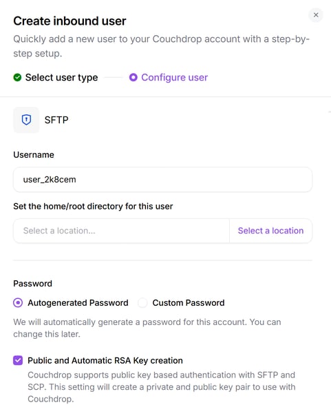 For Couchdrop users, using SSH keys is as simple as a checkbox when adding a new inbound SFTP user. Couchdrop automatically generates the key pair and provides you with the credentials to send or download immediately.